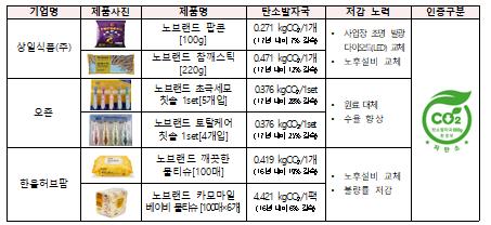 이들 제품 중에 한울허브팜, 상일식품㈜, 오죤 등 3개 기업이 생산한 과자, 칫솔, 물티슈 등 6개 생활밀착형 제품은 유통사 자체상표 제품에서는 처음으로 저탄소제품을 인증받았다.