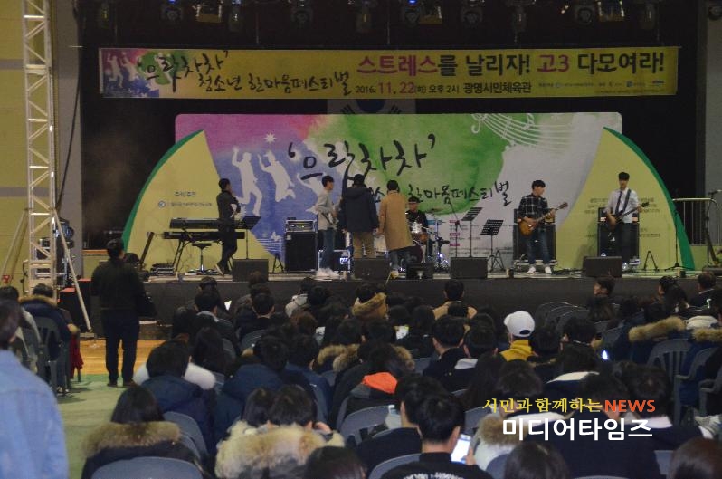 | 22일 광명시민체육관에서 열린 "으랏차차" 청소년 한마음페스티벌에서 참가자 학생들이 경연을 하고 있다.<사진/ⓒ미디어타임즈> |