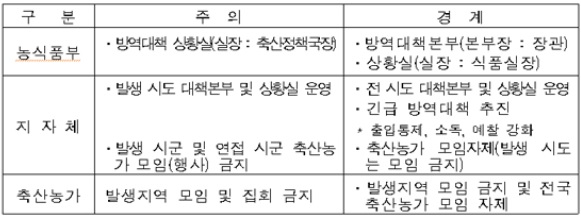 AI 위기 단계가 ‘경계’로 격상하면 AI 긴급행동지침에 따라 전국 시·도(시·군)에 방역대책본부 및 상황실이 확대 설치·운영된다.