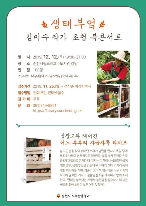 순천시는 오는 12월 12일 오후 7시 순천시립조례호수도서관에서 ‘생태 부엌’의 저자 김미수 작가를 초청해 북콘서트를 개최한다.