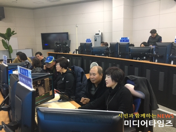 | 수원시 방범기동순찰대 임원들이 CCTV 통합관제센터를 견학하고 있다. <ⓒ미디어타임즈> |