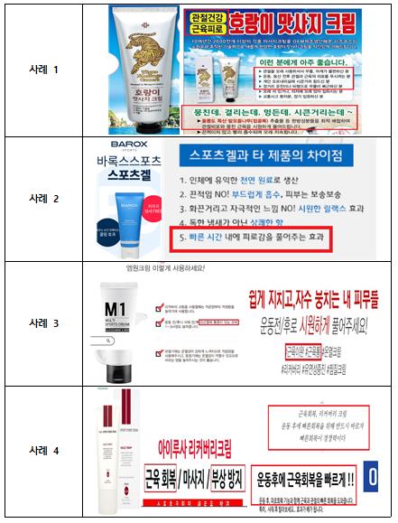 또한 ‘기능성화장품’으로 심사/보고하지 않은 제품을 ‘주름개선’ 등 기능성화장품으로 오인할 우려가 있도록 광고하거나 ‘부상 방지/회복’, ‘경기력 향상’ 등 소비자가 오인할 우려가 있도록 광고한 경우도 적발됐다.