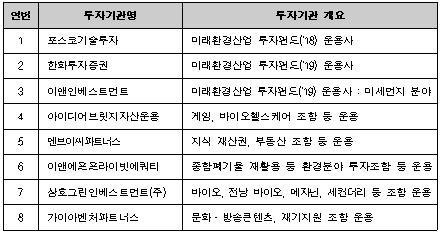 8개 벤처투자기관은 포스코기술투자, 한화투자증권, 이앤인베스트먼트, 아이디어브릿지자산운용, 엔브이씨파트너스, 이앤에프프라이빗에쿼티, 삼호그린인베스트먼트, 가이아벤처파트너스 등이다.