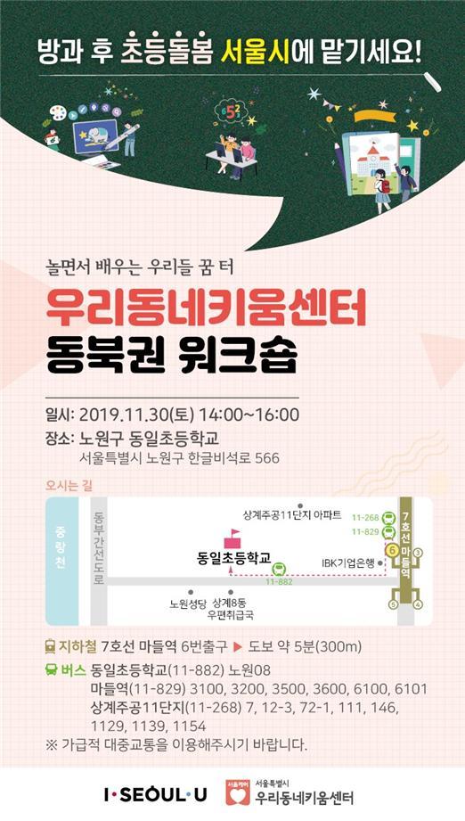 동북권 워크숍은 ‘서울이 꿈꾸는 방과 후’ 키움 토크콘서트 우리동네키움센터를 알리는 ‘모둠별 원탁토론회’ 눈으로 보고 직접 체험도 하는 돌봄홍보관으로 구성된다.