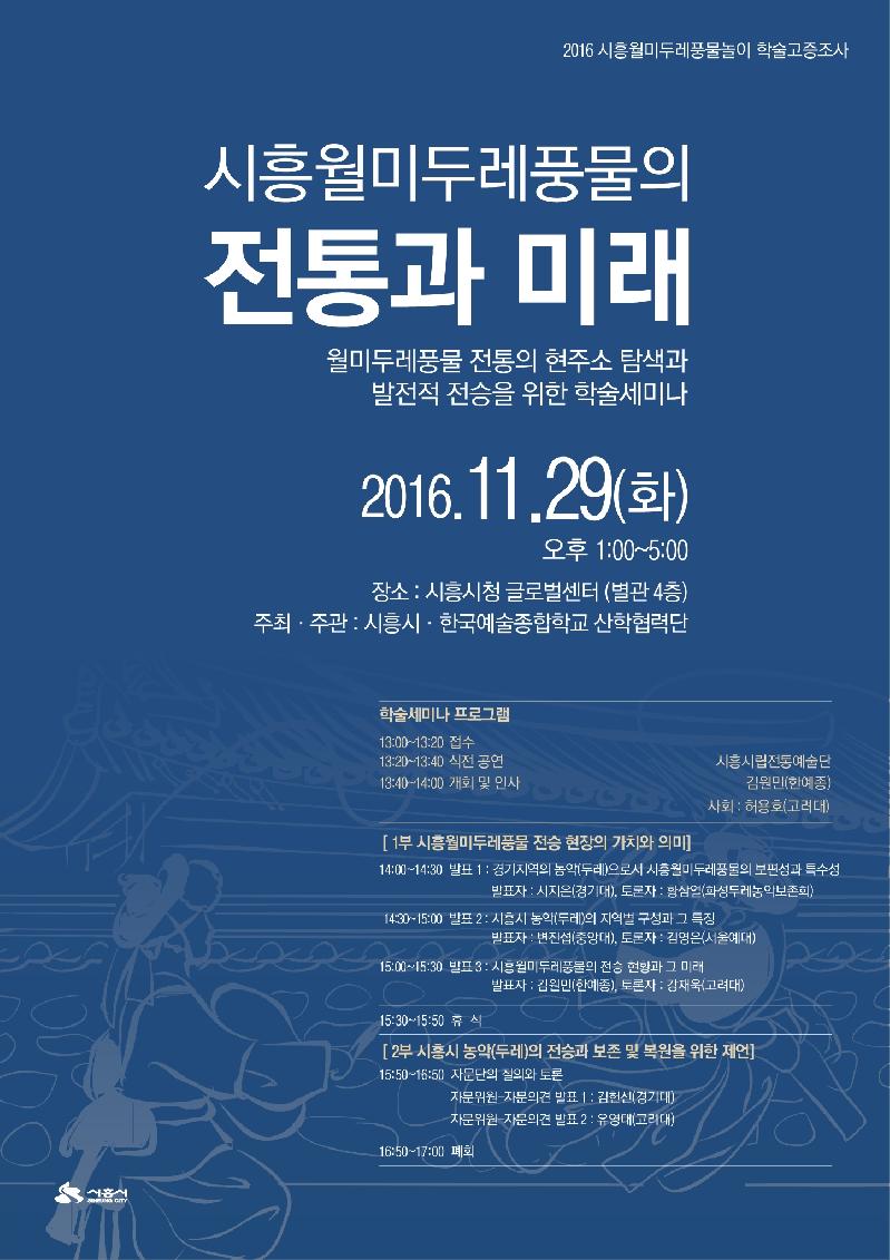 학술세미나 1부 ‘시흥월미두레풍물 전승 현장의 가치와 의미’에서는 수행된 학술고증조사 내용을 중심으로 3편의 학술발표와 토론이 이루어지며, 2부 ‘시흥시 농악(두레)의 전승과 보존 및 복원을 위한 제언’에서는 1부의 발표 내용을 중심으로 한 자문단의 의견 발표와 종합토론이 진행된다.