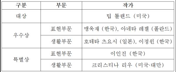 1차 심사결과 선정된 작가를 대상으로 진행한 2차 심사를 통해 대상에는 팁 톨랜드, 표현부문 우수상에는 맹욱재, 아네타 레겔, 생활부문 우수상에는 호테타 츠요시, 이정원, 표현부문 특별상에 이인진, 생활부문 특별상에 크리스티나 리우 등 총 7명의 작가가 선정됐다.
