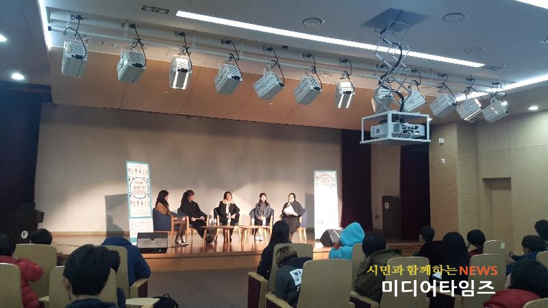 | 18일 열린 광명시민인권학당에서 정복선, 조세영 학생과 주미화 교육희망네트워크 대효, 강옥희 광명YMCA 총무가 학벌사회에 대해 이야기 하고 있다 <ⓒ미디어타임즈> |