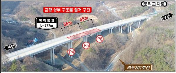 철거 및 재시공 공사기간 동안 방하목교는 보은방향 2개 차로가 전면 통제되어 옥천방향 2개 차로가 양방향 통행으로 전환·운영되며 재시공 완료시까지 도로 순찰, 과적 단속을 강화하고 강우·강설 등의 기상 악화에도 철저히 대비해 사고를 예방할 계획이라고 전했다.