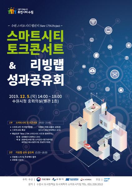 수원시는 오는 12월 5일 오후 2시 시청 중회의실에서 ‘스마트시티 토크 콘서트·리빙랩 성과 공유회’를 연다.