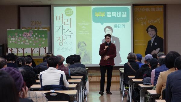 ‘중년이후 부부 행복비결’이라는 주제로 11월 21일 열린 1차 강연은 윤태익 교수가 인간의 타고난 성질을 머리형, 가슴형, 장형 3가지로 나누어 유형별 행동패턴을 소개했다. 또한 부부간 다른 행동과 의견차가 생기는 것은 틀린 것이 아니라 다른 것임을 강조하며 서로 다르다는 것을 인정하고 이해하는 것이 중요하다고 말했다.