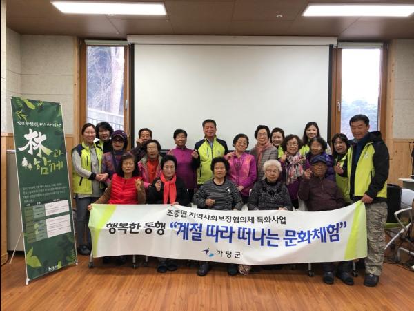 조종면 지역사회보장협의체와 명예사회복지공무원은 지난 28일 조종면 지역사회보장협의체 특화사업인“계절따라 떠나는 문화체험”으로 사례관리대상자 어르신 14명을 초청해 협의체 위원 및 명예사회복지공무원과 함께 가평군 환경성질환예방관리센터에서 진행하는 어르신 면역증진 프로그램인 ‘林과 함께’를 실시했다.
