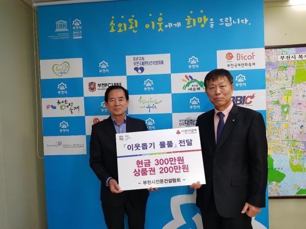 부천시전문건설협회는 따스한 손길이 필요한 어려운 이웃을 위해 꾸준히 기부하며 사랑으로 함께하는 세상 만들기에 앞장서고 있다.