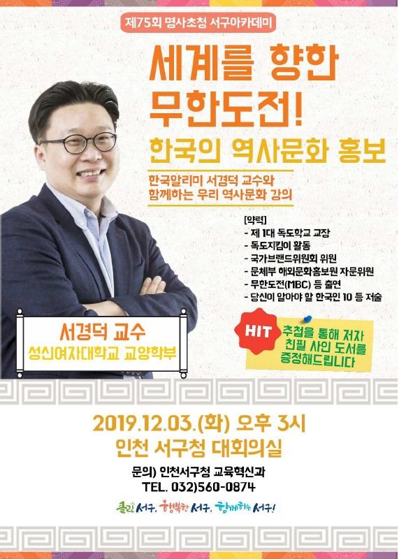 인천 서구는 오는 12월 3일 오후3시 서구청 대회의실에서 ‘독도지킴이’ 서경덕 성신여자대학교 교수를 초청해 제75회 명사초청 서구아카데미를 진행한다.