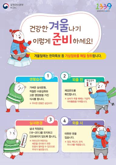 이 자료에는 한파 시 일반 건강수칙은 물론 어르신, 어린이, 만성질환자 등 더욱 주의가 필요한 경우의 대처 요령과 이 밖에 심근경색, 뇌졸중, 낙상사고 호흡기질환 등 겨울철에 특히 주의할 질환에 대한 상세한 내용을 담았다.