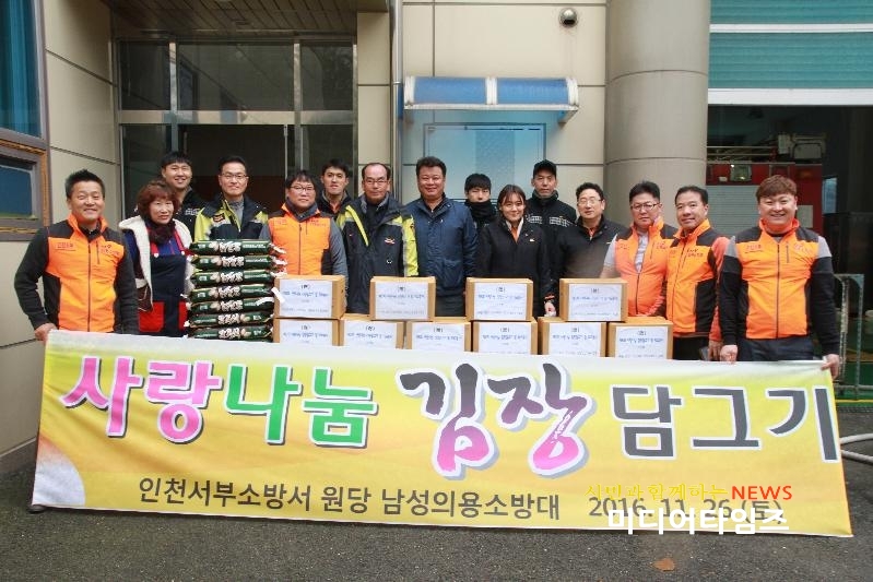 [미디어타임즈=문상수 기자] 인천서부소방서(서장 김준태) 원당119안전센터와 원당남성의용소방대에서 지난 11월 26일(금) 동절기를 맞아 소방공무원과 의용소방대원·가족 등 30여명이 참석한 가운데 제5회 사랑나눔 김장담그기 및 의료봉사 행사를 전개했다.이번 사랑나눔 김장담그기 및 의료봉사 행사는 연말연시 불우한 이웃들이 따뜻한 겨울을 나는데 조금이나마 보탬이 되고자 김장김치 150포기 및 쌀(10kg) 30포를 검단지역 독거노인가구 및 장애인가정 등에 나누어 주었다.또한 원당119안전센터에서는 독거노인 및 몸이 불편한 장애인에 대해 혈압 및 혈당체크 등 기초 의료봉사활동을 실시하였다.김동근 원당남성의용소방대장은 “추운 날씨에도 김장에 참여해준 대원들에게 감사의 마음을 전한다”며 “앞으로도 대원들과 함께 지역사회 어려운 이웃을 위해 실질적인 도움이 되는 봉사활동을 지속해 나가겠다.”고 밝혔다.