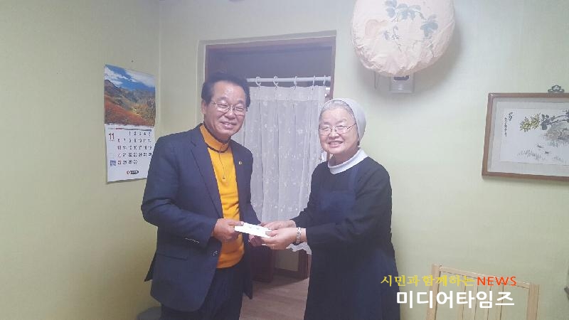 | 26일 최지용의원이 애덕가정의 집을 방문해 위문금을 전달하고 있다. <ⓒ미디어타임즈> |