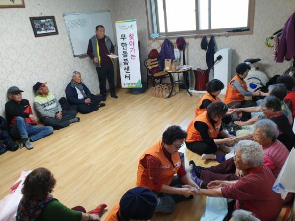 삼거2리 경로당 어르신 20여명을 대상으로 보건복지 정보 제공과 홍보 물품을 전달했고 특별히 이번 찾아가는 무한돌봄 센터는 생명사랑연천봉사단 단원들이 참여해 웃음 치료와 손 마사지 봉사를 실시해 더욱 뜻깊었다.