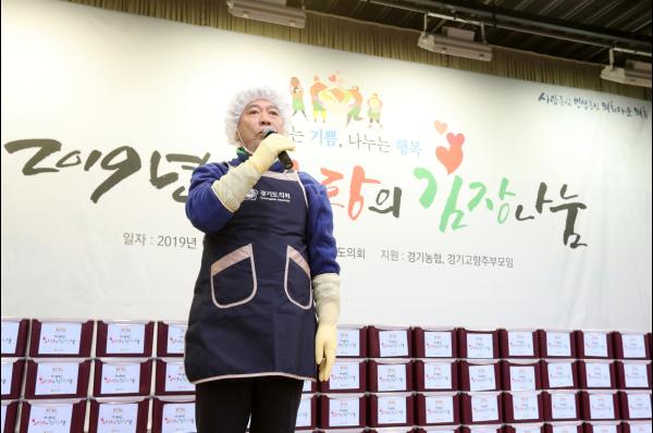 송한준 의장과 김원기·안혜영 부의장, 염종현 더불어민주당 대표의원, 상임위원장 등 도의원들은 29일 오전 의회 홍보대사인 가수 현숙씨, 개그맨 김종석씨와 경기농협본부 및 경기고향주부모임 자원봉사자 등 120여명이 참가한 가운데 의회 대회의실에 열린 ‘2019년 경기도의회 사랑의 김장 나눔행사’에서 1,200포기의 김장을 함께 했다.