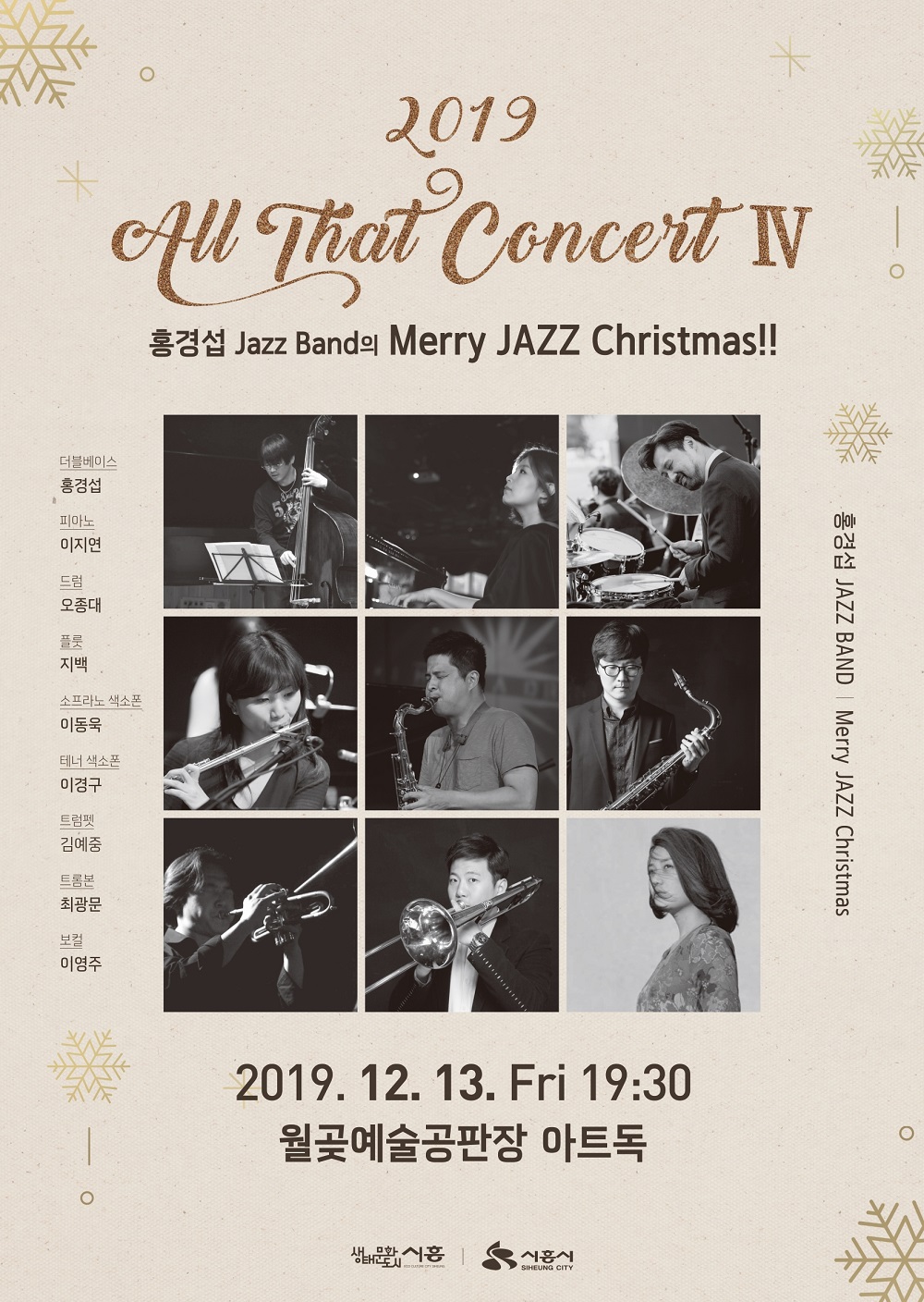 시흥시민의 문화예술 향유와 창조력 함양을 위해 분기별로 진행되는 ‘올 댓 콘서트’의 마지막 에피소드인 ‘홍경섭 Jazz Band’를 통해 추운 겨울 사랑하는 가족, 연인, 친구와 함께 따뜻하고 기분 좋은 시간이 될 수 있기를 기대한다. 본 공연은 별도의 접수절차 없이 누구나 참여 가능하며 참가비는 무료이다.