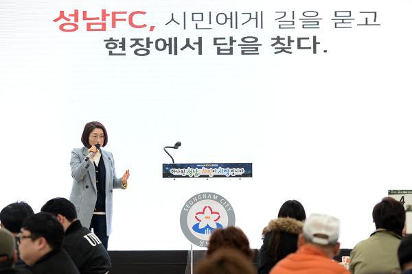 이날 은수미 성남시장은 인사말을 통해 ‘성남fc 활성화를 위한 공동의 뜻을 갖고 한자리에 모인 300여명의 시민들께 감사드리며 오늘 이 자리에서 성남FC의 발전을 위한 참신한 방안들이 나오길 기대한다’고 말했다.