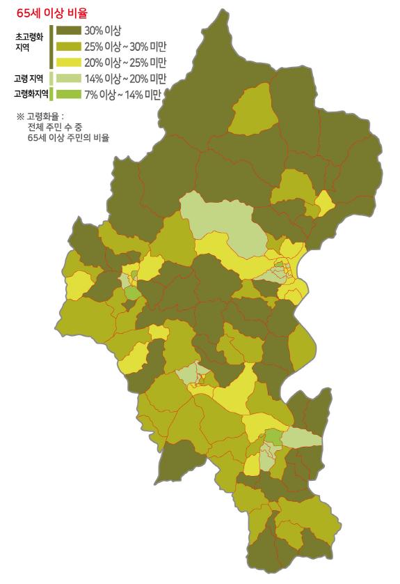 지도에는 65세 이상 인구가 전체 인구의 20%를 넘는 초고령화 행정리가 총 126개리 중, 83%에 달하는 105개리에 이르며 이 중 30% 이상되는 지역도 46개리로 가평군 1/3을 넘는 고령화 위기도를 잘 보여주고 있다.