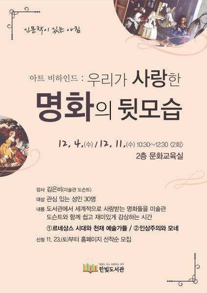 파주시 한빛 도서관은 오는 4일과 11일 오전 10시 30분 성인기획강좌 ‘아트 비하인드:우리가 사랑한 명화의 뒷모습’ 강좌를 운영한다.
