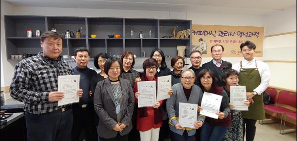 부천시 인생이모작지원센터는 지난달 28일 커피머신관리에 관심이 높은 베이비부머 등 중장년층 12명을 대상으로 실시한 ‘2019년 제3기 커피머신관리사 양성과정’ 교육 수료식을 개최했다.