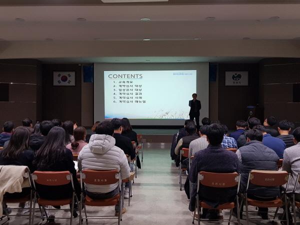 이날 교육은 청렴 캠페인 영상 시청, 일상감사 대상업무 및 기준, 계약심사 사례 전파, 계약운영 요령, 질의응답 순으로 진행했다.