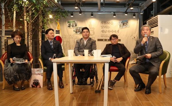송한준 경기도의회 의장이 장애에 대한 편견과 중년의 무게를 뛰어 넘어 미국 대륙횡단을 해낸 ‘세 남자’를 만나 ‘장애인과 비장애인이 더불어 살아가는 사회’를 만드는 데 함께해 나갈 것을 약속했다.