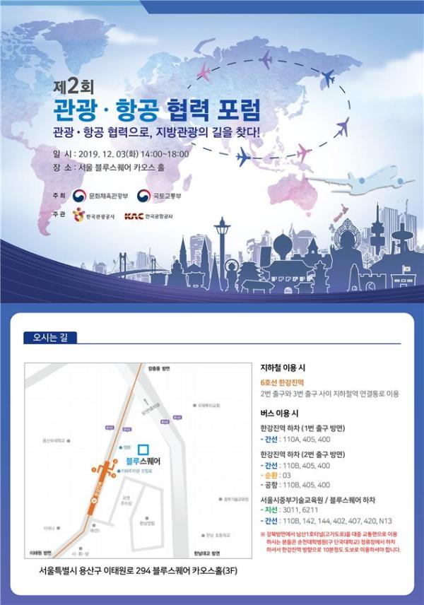 문화체육관광부와 국토교통부는 한국관광공사, 한국공항공사와 함께 오는 3일 오후 2시 서울 블루스퀘어 카오스홀에서 ‘제2회 관광·항공 협력 포럼’을 개최한다. 토론회에는 문체부 박양우 장관, 국토부 권용복 항공정책실장을 비롯해 지자체, 유관기관, 연구기관, 관광업계, 항공업계 종사자 등 관광과 항공 분야 관계자 200여명이 참석할 예정이다.