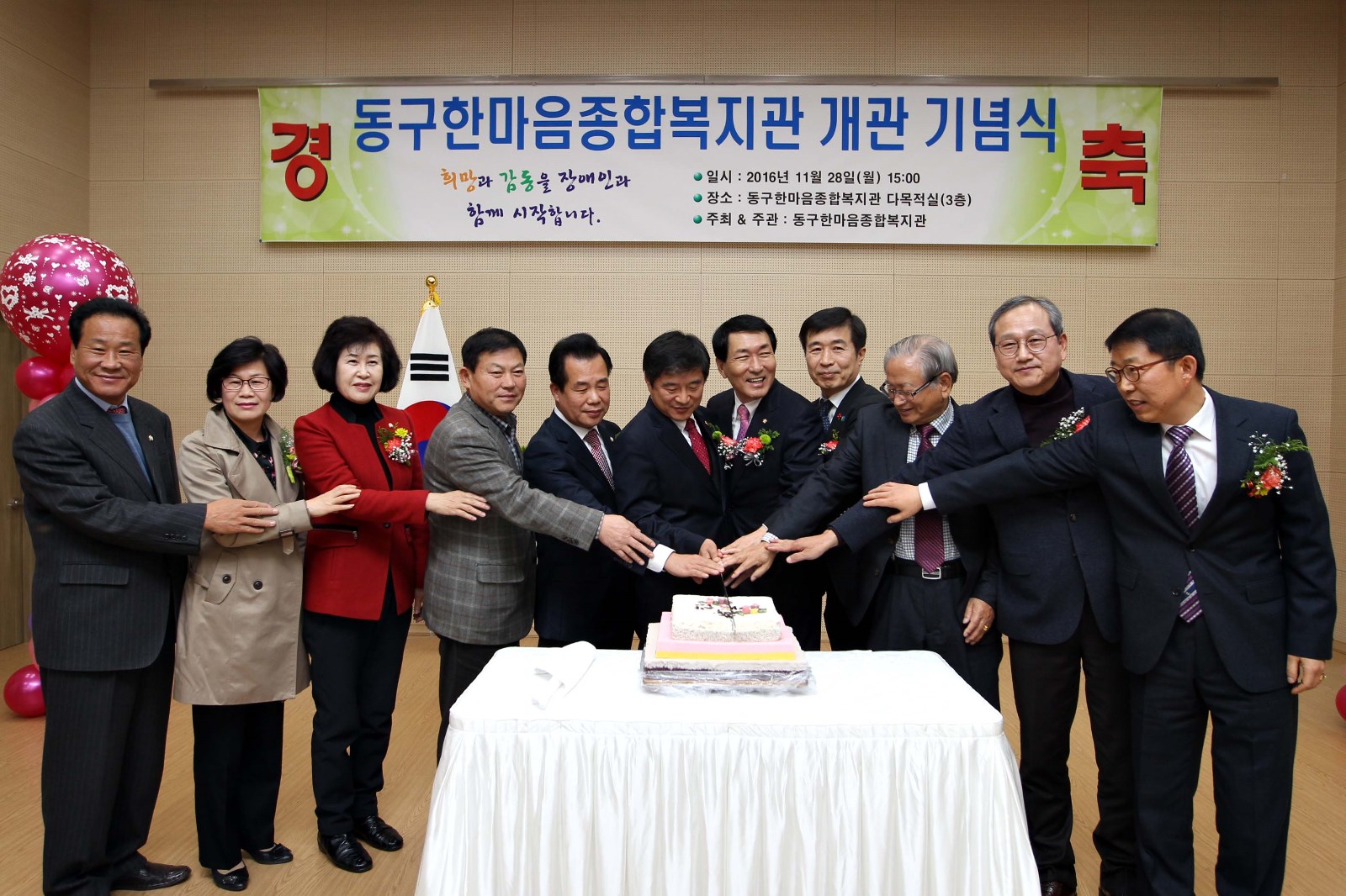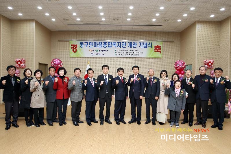 | 한마음종합복지관 개관식 후 기념 촬영을 하고 있다. <ⓒ미디어타임즈> |