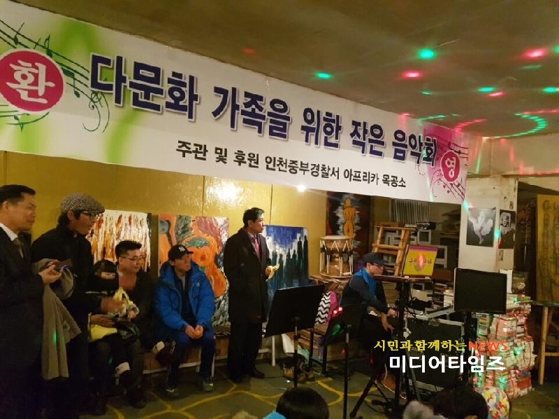 [미디어타임즈=문상수 기자] 인천중부경찰서(총경 김상철)는 지난28일 다문화가정 결혼이주여성 및 자녀 50여명을 초대, 관내 목공소 문화공간을 이용한 ‘작은 음악회’를 개최했다.평소 공연 관람의 기회가 적은 관내 저소득층 다문화가정의 공감문화 형성을 위해 중부서와 중구지역 예술인이 뜻을 모아 추진하게 된 것으로, 이번 행사는 실용음악과 밴드 동아리의 재능기부로 모두가 즐길 수 있는 신나는 재즈와 난타 공연을 다문화가정에게 선물했다. 김상철 서장은 다문화가정과 지역사회의 문화 소통이 서로의 다름을 이해할 수 있는 좋은 기회가 될 것이라며 함께 어울릴 수 있는 지속적인 행사가 될 수 있도록 노력하겠다고 밝혔다.
