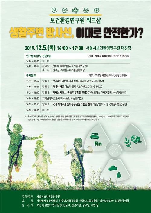 서울시보건환경연구원은 오는 5일 오후 2시부터 과천시 장군마을에 위치한 연구원 본관 2층 대강당에서 ‘생활주변방사선, 이대로 안전한가?’를 주제로 워크숍을 개최한다.