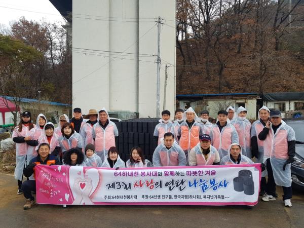 해마다 사랑의 연탄 나눔 봉사를 하고 있는 64 하내천 봉사대의 홍봉식 회장은 “우리들의 작은 나눔으로 도움이 필요한 이웃이 따뜻한 겨울을 보낼 수 있게 되어 기쁘다. 앞으로도 지속적인 나눔 활동을 하도록 노력하겠다”고 말했다.