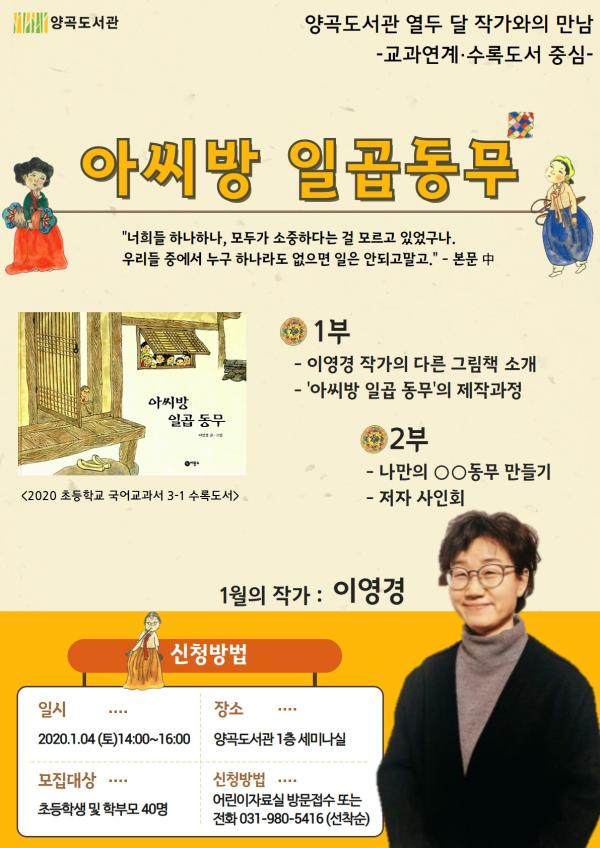 김포시 양곡도서관은 어린이들의 자율적이고 지속적인 독서습관 형성을 위해 그림책 ‘아씨방 일곱동무’, ‘오러와 오도’의 저자인 이영경 작가를 초청해 작가와의 만남을 진행한다.