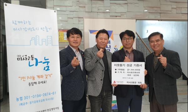 미사2동 행정복지센터와 지역사회보장협의체는 ‘하남미사골프클럽 ’에서 미사2동 지역사회보장협의체 ‘나눔실천’에 성금 100만원을 기탁했다고 2일 전했다.