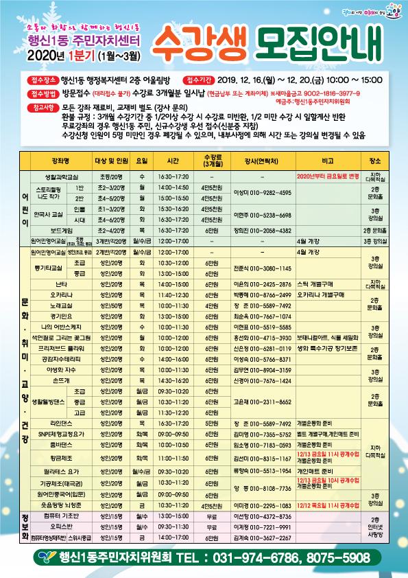 2020년 1분기 행신1동 주민자치센터 프로그램은 20여 개 강좌이며 운영기간은 2020년 1월부터 3월까지 3개월 동안이다.