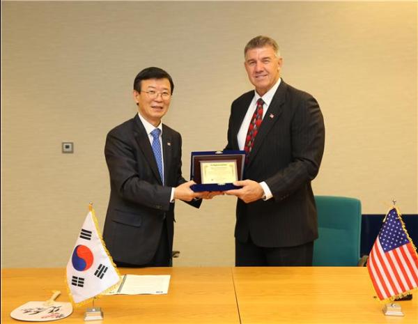 해양수산부는 제31차 국제해사기구 총회기간 중인 지난 달 29일 오후 런던 IMO 본부에서 열린 ‘한미 양자회의’를 계기에, 미국 해안경비대 칼 슐츠 사령관에게 감사패를 수여했다.