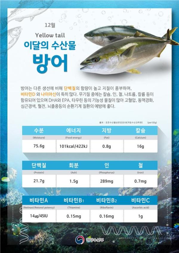 해양수산부 관계자는 “12월 이달의 수산물로 선정된 방어와 굴은 겨울철에 영양가가 높고 맛도 좋으므로 많이 드시고 추운 겨울을 건강하게 보내시길 바란다”고 말했다.