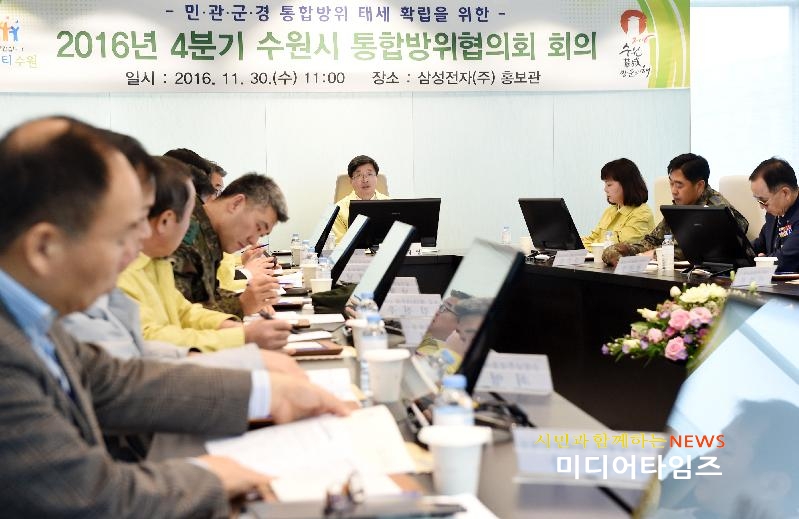 [미디어타임즈= 신정식 기자] 수원시가 30일 삼성전자(주) 디지털시티 홍보관에서 민‧관‧군‧경 통합방위 태세를 확립하기 위한 2016년 4분기 수원시 통합방위협의회를 개최했다.