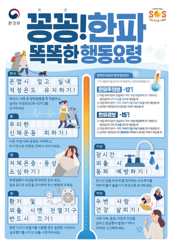 특히 환경미화원 한랭질환 예방을 위해 각 사업장별 자율점검표를 배부해 점검하도록 하고 한랭질환 예방 수칙 및 위험수준별 대응요령 등을 중점 홍보할 예정이다.