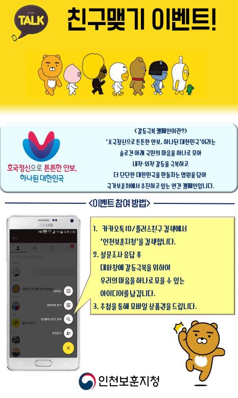 국가보훈처에서 올해 초부터 ‘호국정신으로 튼튼한 안보, 하나된 대한민국’이라는 슬로건 아래 우리사회의 다양한 갈등을 국민의 나라사랑으로 극복하여 하나된 대한민국을 만들자는 취지로 갈등극복 캠페인을 전개해 왔으며, 이의 일환으로 인천보훈지청은 카카오톡 페이지를 통해 우리의 마음을 하나로 모을 수 있는 다양한 아이디어를 받는 이벤트를 진행하고 있다.