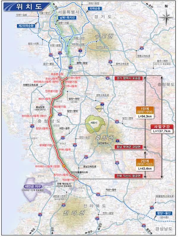 국토교통부는 경기도 평택시 포승읍에서 전라북도 익산시 왕궁면을 잇는 평택~부여~익산 고속도로의 실시계획을 지난 2일 승인했다고 밝혔다.