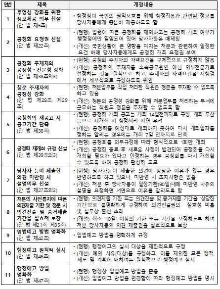 이번 법 개정은 ‘국민이 주인인 정부’ 실현을 위해 행정절차 과정에 국민의 참여를 확대해 국민의 권익보호를 강화하고 행정 전 과정의 투명성을 제고하기 위해 진행됐다.