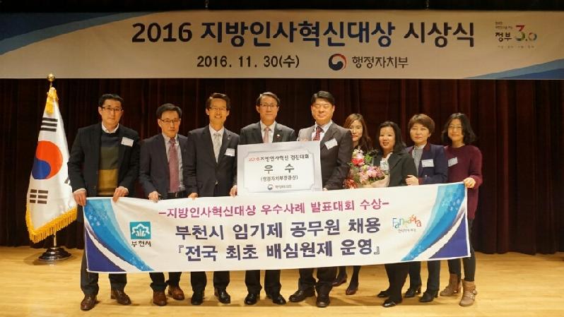 [미디어타임즈= 이영희 기자] 부천시가 30일 행정자치부 지방인사혁신단 주관으로 열린 ‘2016 지방인사혁신대상’에서 우수상(행정자치부장관상)을 받는 영예를 안았다.