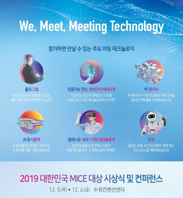 4차 산업혁명 시대가 심화되는 가운데 국내 마이스산업의 새로운 도약과 발전을 기하고 중소기업들의 육성을 위해 문체부와 공사는 이달 5일부터 6일까지 수원컨벤션센터에서 열리는 ‘2019 대한민국 마이스 대상 시상식 및 콘퍼런스’에서 미팅 테크놀로지를 참석자들에게 선보인다.