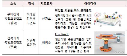 이중에 산업현장의 문제를 해결한 아이디어는 소정의 장학금을 받고 관련기업으로 기술이전 예정으로 특히 구미전자공업고팀의 ‘다양한 뮤직블록’ 아이디어는 내년 상반기에 협력기업에서 제품화 할 계획이라고 전했다.