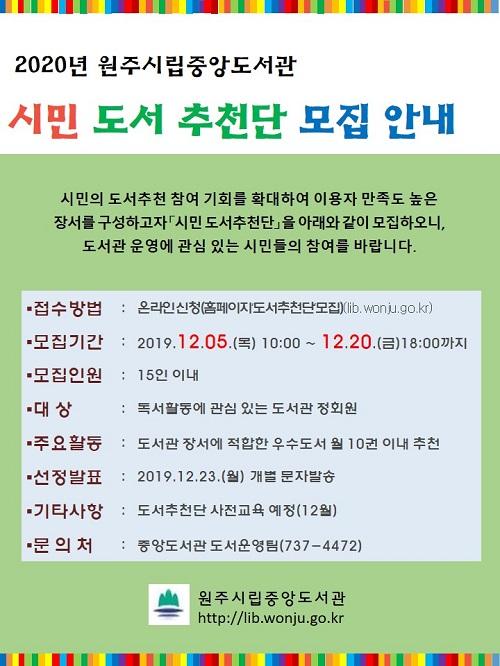 원주시립중앙도서관은 시민의 도서 추천 참여 기회 확대를 통한 만족도 높은 도서관 장서 확충을 위해 ‘시민 도서추천단’을 모집한다.