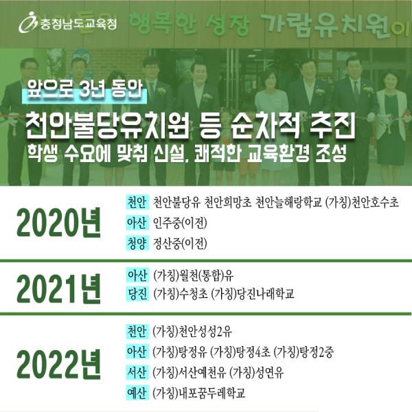 내년 천안에는 천안불당유치원, 천안희망초, 천안늘해랑학교, 천안호수초 가 설립되며 아산에서는 인주중학교, 청양에서는 정산중학교가 이전 설립된다.