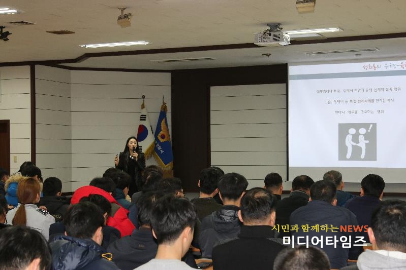 | 1일 인천 서부서 4층 대강당에서 ‘직장내 성희롱 예방교육’ 에서 직원들이 평소 간과할 수 있는 성차별 유형 등 성인지력 제고에 초점을 맞춰 교육을 실시했다.. <ⓒ미디어타임즈> |